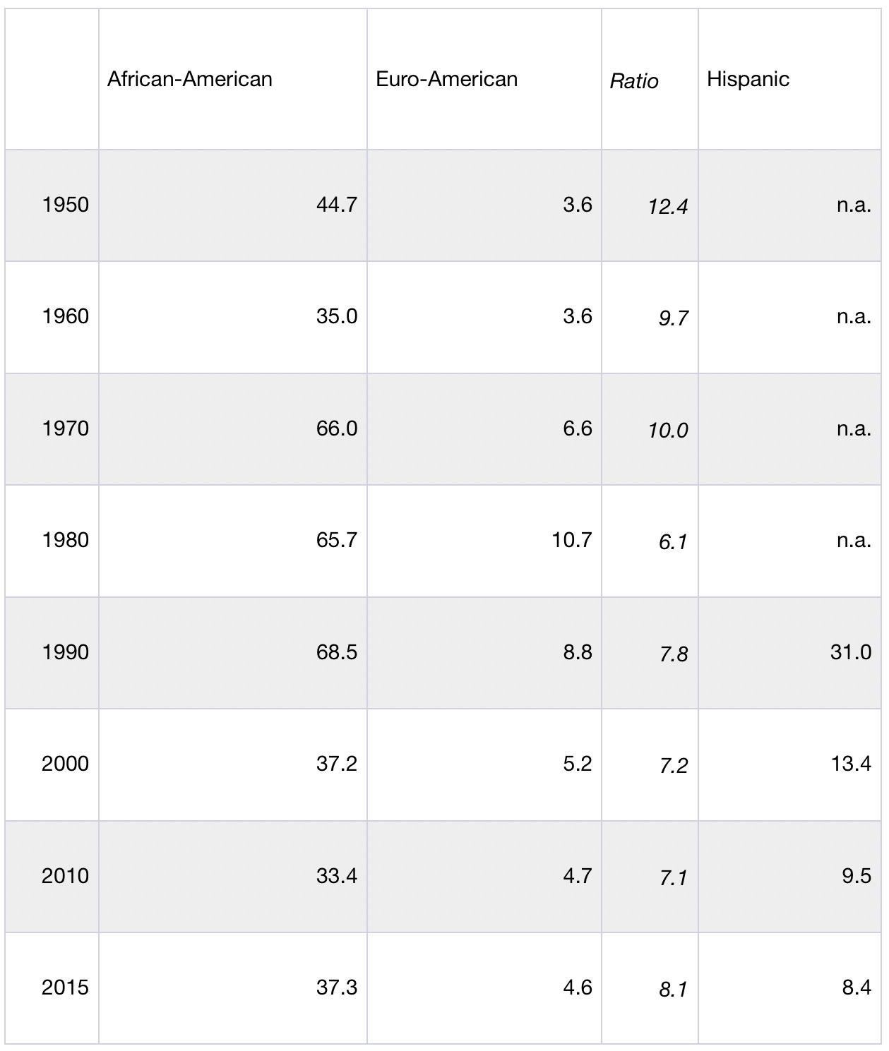 Thus, the predictable result of DIY public order was a much higher level of violence—particularly homicide—in the segregated descendants-of-American-slaves communities. That the overall male homicide death rate in descendants of American slaves communities was twelve times that in Euro-American communities in 1950, when descendants of American slaves were a tenth of the US population and their family structure was largely intact, speaks to the long-term failures in providing public order in those communities. The fall in that homicide ratio since indicates some converging of performance by police jurisdictions in the US, but from a low benchmark.