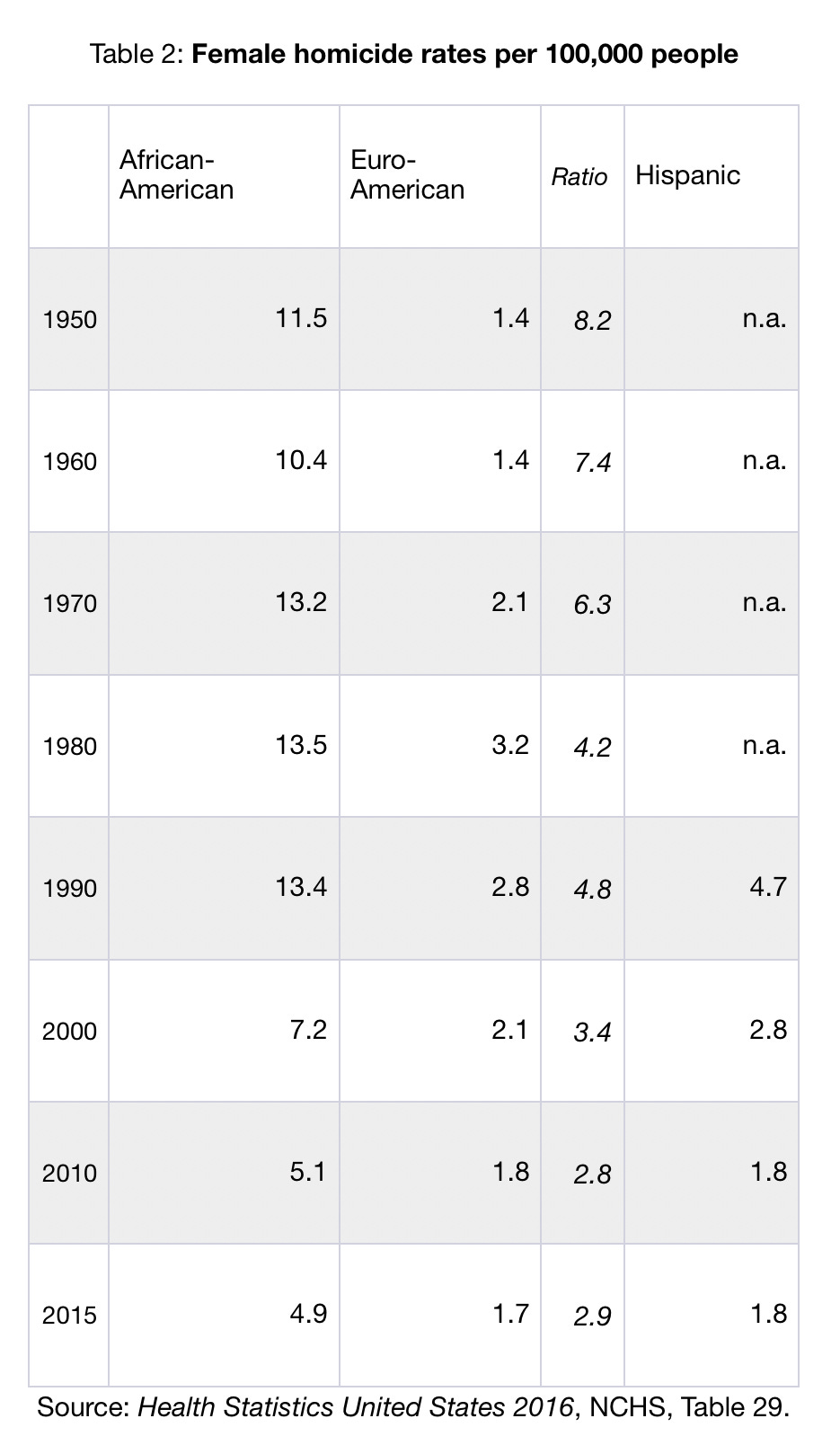 That four percent was seven per cent of the male population and less than one percent of the female population. The male-to-female ratio of violent crime is much the same as the recent Euro-American/African-American homicide ratios, but is rather more stable than the latter.