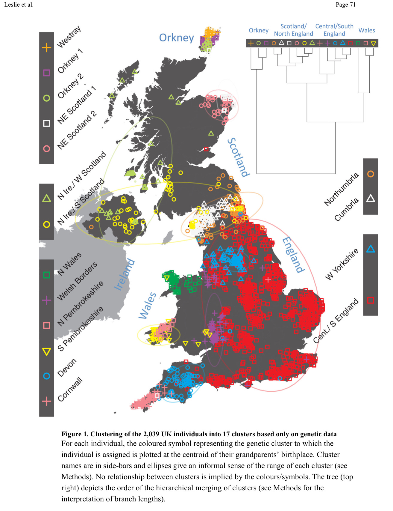 Stephen Leslie, Bruce Winney, Garrett Hellenthal, Dan Davison, Abdelhamid Boumertit, Tammy Day, Katarzyna Hutnik, Ellen C Royrvik, Barry Cunliffe, Wellcome Trust Case Control Consortium, International Multiple Sclerosis Genetics Consortium, Daniel J Lawson, Daniel Falush, Colin Freeman, Matti Pirinen, Simon Myers, Mark Robinson, Peter Donnelly, and Walter Bodmer, ‘The fine scale genetic structure of the British population,’ Nature, 2015 March 19; 519(7543): 309–314.