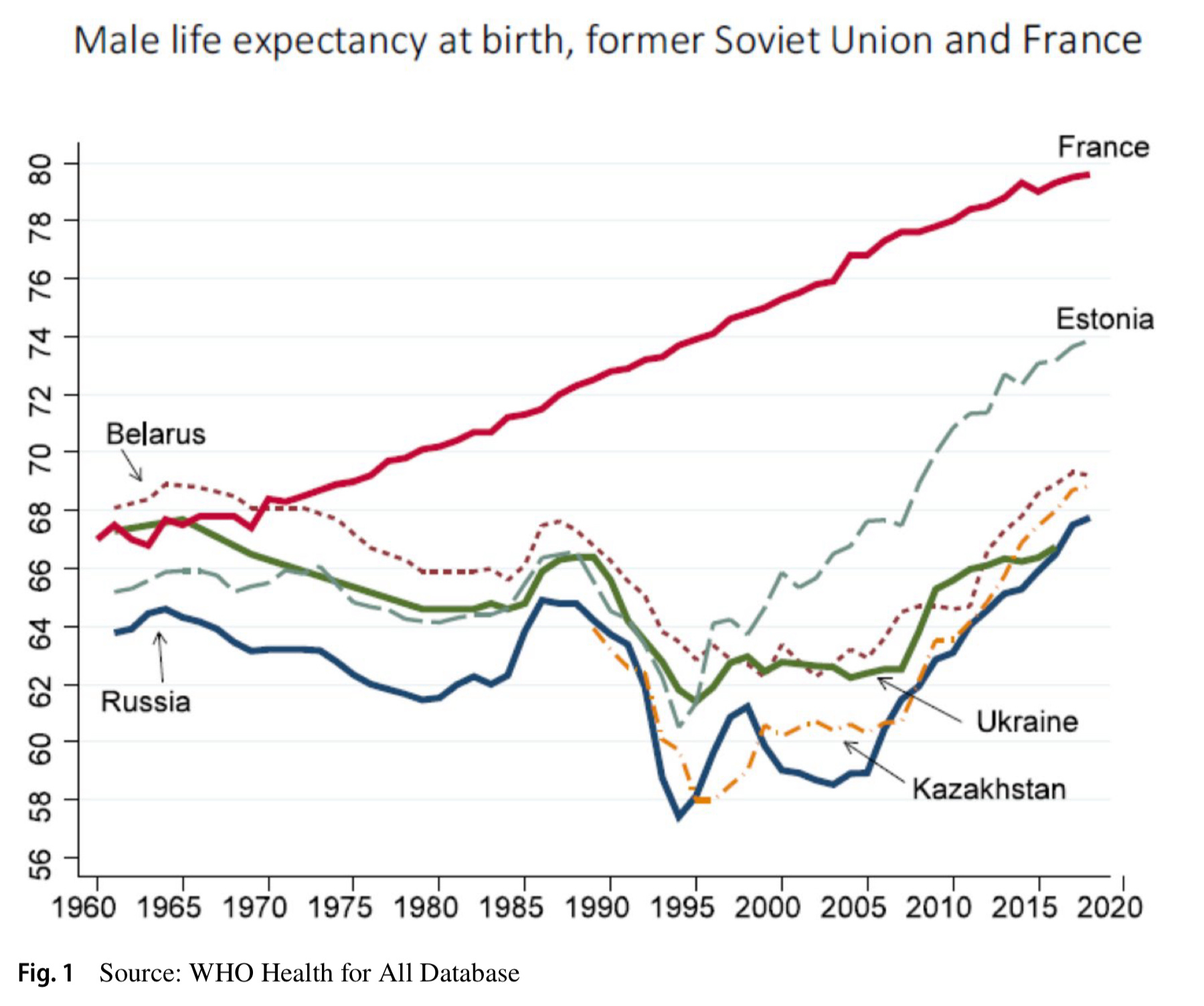 Elizabeth Brainerd, ‘Mortality in Russia Since the Fall of the Soviet Union,’ Comparative Economic Studies, (2021) 63: 557–576. https://pmc.ncbi.nlm.nih.gov/articles/PMC8553909/