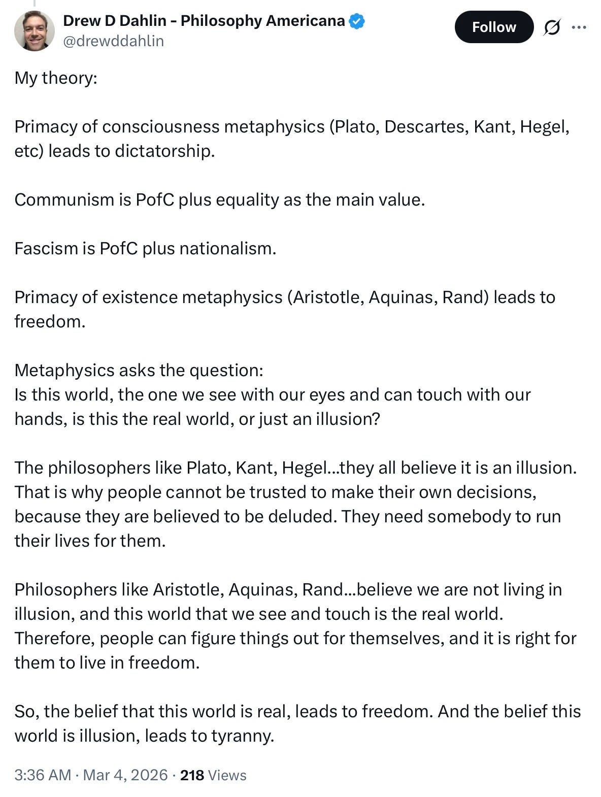 Those who think that the inconsistencies should have purchase, should matter, are embracing the primacy of empirical reality, not the primacy of correct consciousness. Giving lived experience priority—a development from Standpoint epistemology—is precisely about denying a shared reality. Instead, it is about whose consciousness has primacy.