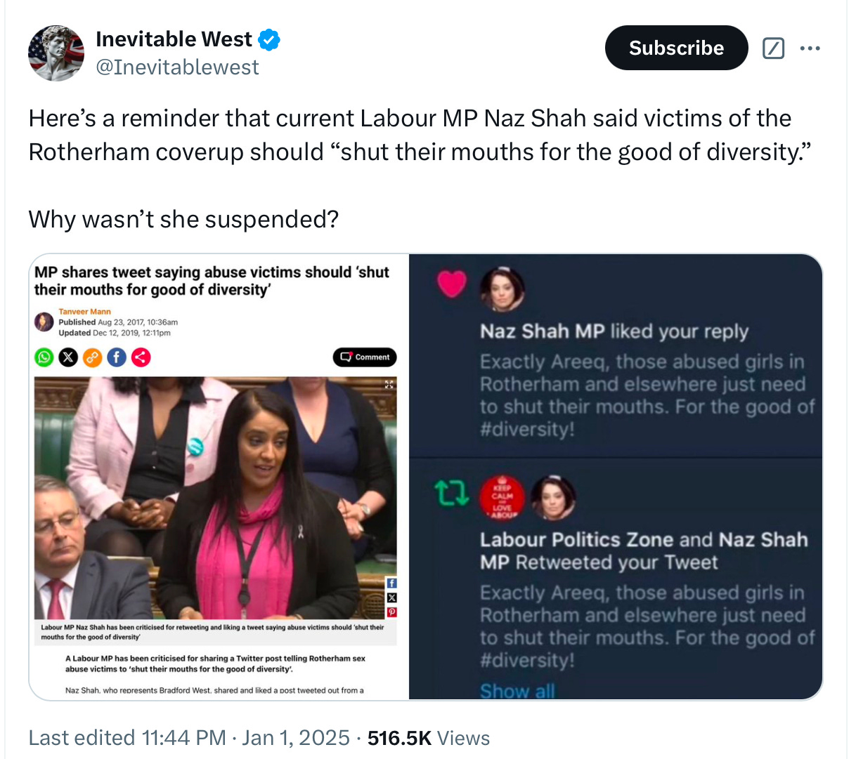 Even now, the move of “quick, change the subject” is on display as members of the British media and commentariat have chosen to be outraged over … Elon Musk making a public fuss about industrial level rape and sexual exploitation of often underage girls going back decades. No, folk like them—folk who own morality—are the ones who should determine what matters and when, what is the approved Current Thing, should set and control the approved public narratives.